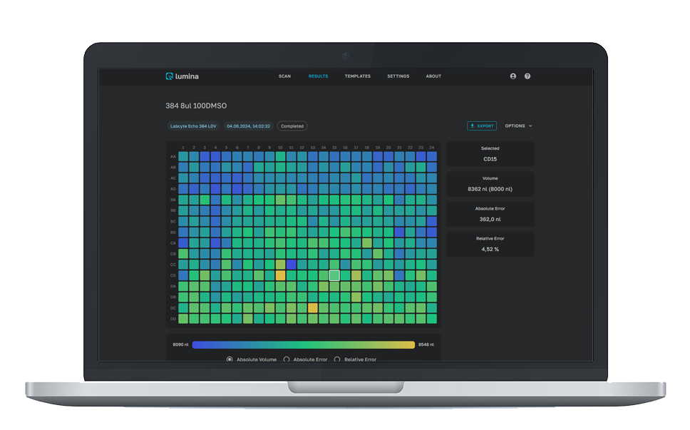LUMINA is an automation-ready, benchtop volume measurement and verification tool for virtually any assay plate. It offers contactless measurement, ultra-fast processing, an intuitive control software as well as the following features: